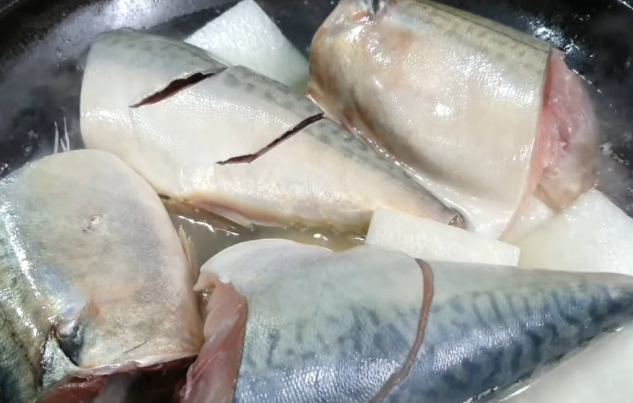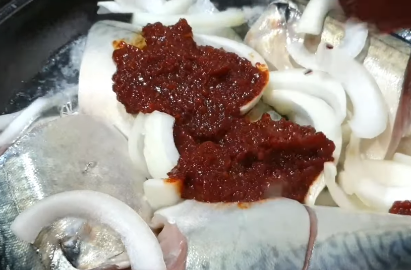- 손질된 고등어를 무 위에 얹고, 양파, 대파, 청양고추를 위에 올립니다.