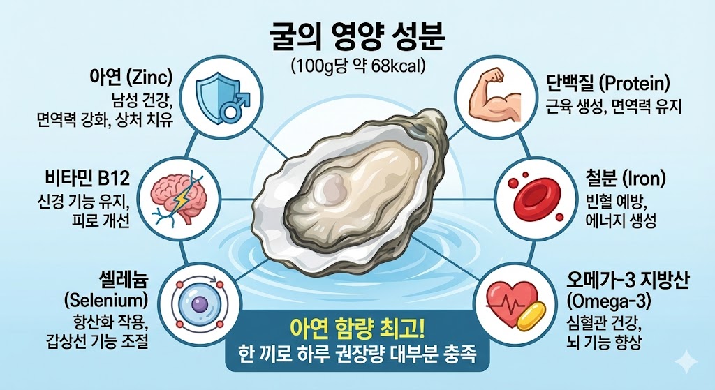특히 굴은 아연 함량이 매우 높은 식품으로, 한 끼만으로도 성인 하루 권장 섭취량을 대부분 채울 수 있을 만큼 영양 효율이 뛰어납니다.