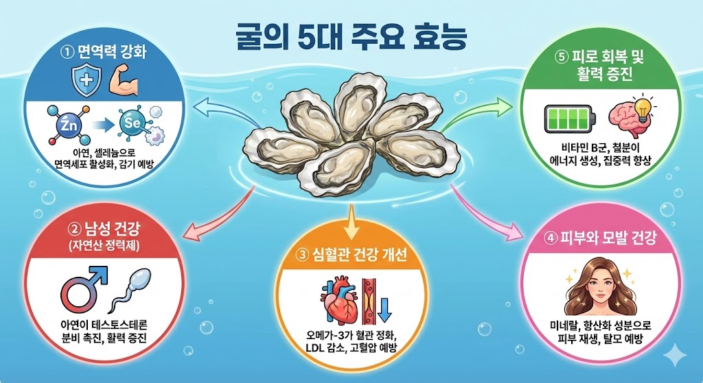 굴 효능은 단순히 영양이 많은 수준을 넘어 전신 건강을 다방면에서 지원합니다. 철분, 아연, 타우린, 오메가3 등 다양한 영양소가 한 번에 들어 있어 성장기, 중장년층, 면역력이 약해진 사람 모두에게 도움이 됩니다. 겨울이 제철이니 이번 시즌에는 굴 효능을 알고 더 건강하게 즐겨보시길 바랍니다.