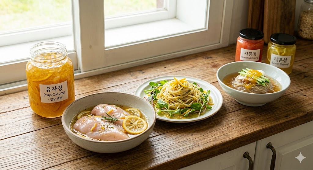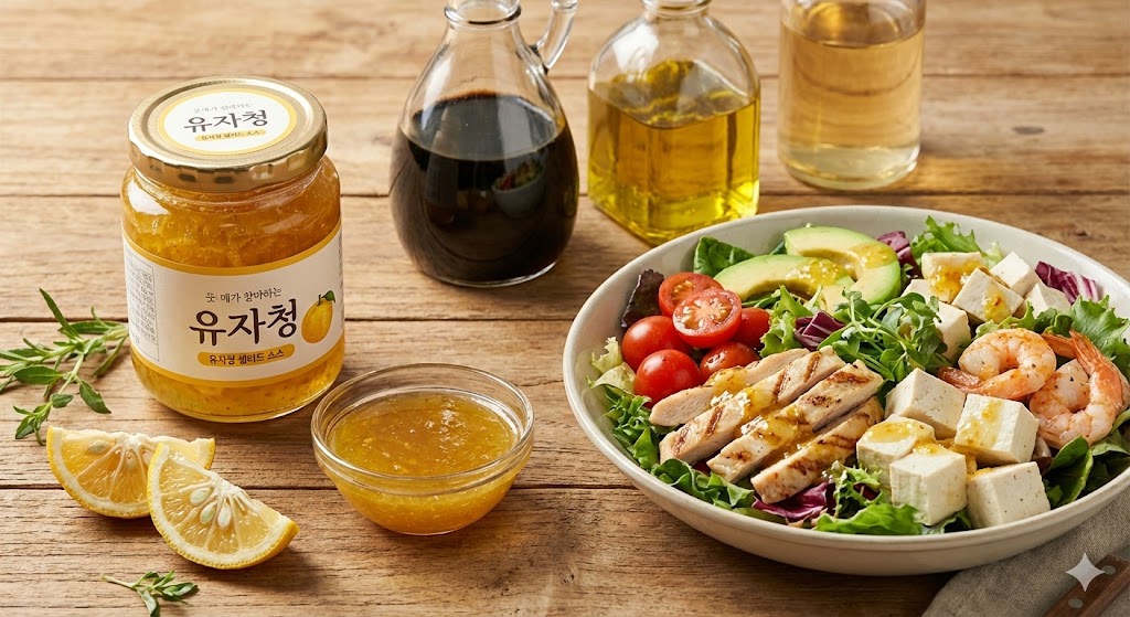 유자청 샐러드 소스는 유자청을 기본으로 간장, 올리브오일, 식초 등을 섞어 만드는 과일 드레싱입니다. 유자청의 향긋한 향과 달콤한 맛이 입맛을 돋워주며, 신선한 채소뿐 아니라 해산물, 닭고기, 두부 등 다양한 식재료에 활용됩니다. 시중 드레싱보다 훨씬 부드럽고 자연스러운 단맛이 특징입니다.
