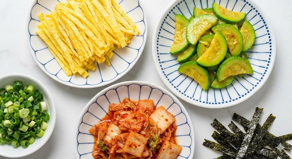 - 고명: 계란지단, 김가루, 호박볶음, 당근채