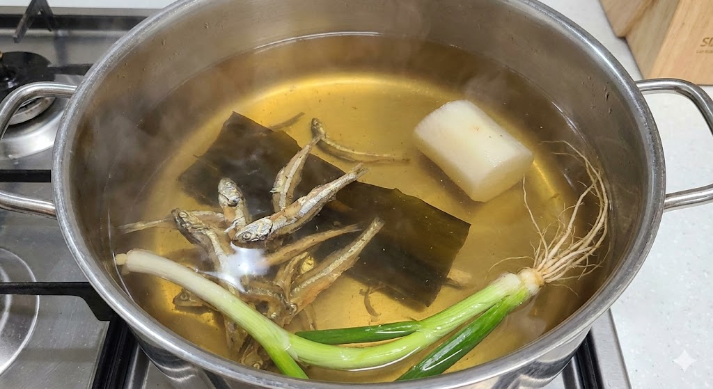 - 물 1.5L에 멸치·다시마·양파·파뿌리 넣기
