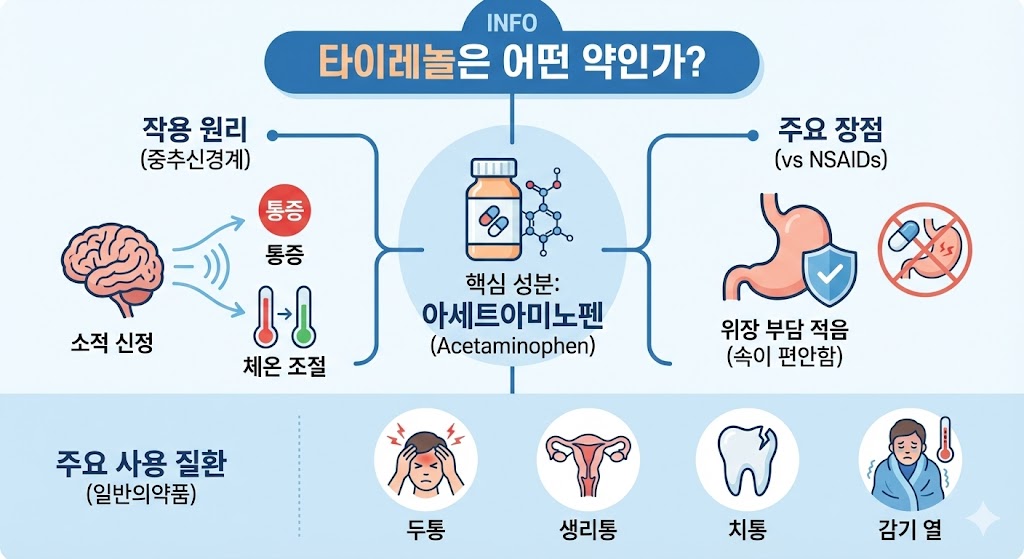타이레놀 효능은 ‘아세트아미노펜(Acetaminophen)’이라는 성분에서 비롯됩니다. 이 성분은 중추신경계에 작용해 통증을 완화하고 체온을 조절하는 기능을 합니다. 비스테로이드성 소염진통제(NSAIDs)와 달리 위 점막을 자극하지 않아 속이 약한 사람도 비교적 안전하게 복용할 수 있습니다. 일반의약품으로 판매되어 두통, 생리통, 치통, 감기 열 등에 널리 사용됩니다.